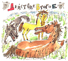 Конь (разглядывая Малыша). Какой у меня вырос красивый сын! (Валится на другую сторону.)