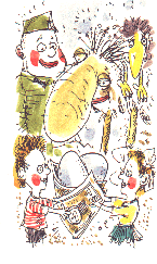 Близнецы развязывают мешок, вылезает Шпион с косыми глазами. Ему дают два яйца.