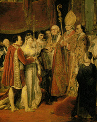 11 марта 1810 г. в Вене, в соборе, окруженном массой народа, при самом торжественном церемониале, в присутствии всей императорской австрийской фамилии, всего двора, всего дипломатического корпуса, сановников, генералитета состоялось бракосочетание 18-летней эрцгерцогини Марии-Луизы с императором Наполеоном. Невеста никогда в глаза не видала жениха, она его даже и в день свадьбы не видела, потому что он, как сказано, счел излишним самому обеспокоиться хотя бы для такого исключительного случая, как собственная свадьба, личной поездкой в Вену. Но с этим в Вене примирились. Маршал Бертье и эрцгерцог Карл вдвоем с достоинством проделали все те манипуляции, которые подобало проделать жениху. Читатель, несомненно, несколько удивится и спросит: как это возможно двум лицам изображать отсутствующего жениха? Удивлялись и современники, не искушенные в деталях царственных свадеб. Бертье был послан Наполеоном в Вену изображать собой императора Наполеона и формально просить руки Марии-Луизы, а эрцгерцог Карл, по просьбе и прямому приглашению Наполеона, должен был явиться в церковь, и здесь Бертье вручил ему Марию-Луизу, которую эрцгерцог Карл (тоже, как до той поры Бертье, изображая собой Наполеона) повел к алтарю и стоял с ней рядом во время богослужения, после чего новая французская императрица была отправлена с подобающими почестями и свитой во Францию. При проезде через вассальные страны (например, Баварию) ей всюду давали почувствовать, что она - супруга повелителя Европы. Наполеон встретил ее недалеко от Парижа, по дороге в Компьен. Тут только супруги в первый раз в жизни увидели друг друга.