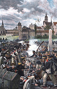 15 апреля 1813 г. Наполеон выехал к своей армии в Эрфурт и двинулся против русских и пруссаков. Снабжена была армия очень хорошо. В течение всех первых месяцев 1813 г. Наполеон, просиживая дни над созданием и организацией армии, посвящал часть своих ночей на упорядочение финансов, и теперь армия ни в чем не нуждалась и могла за все платить звонкой монетой,- важно было не разорять и не раздражать жителей германских стран, пока еще 'союзных', т. е. покорных.